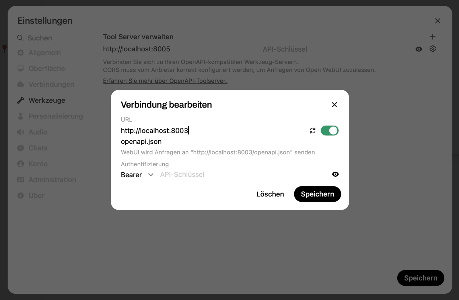 Die Integration in Open WebUI erfolgt analog dem STDIO Transport per MCPO, jedoch etwas einfacher, da hier MCPO den MCP Server nicht per Docker starten muss, sondern direkt zugreifen kann: