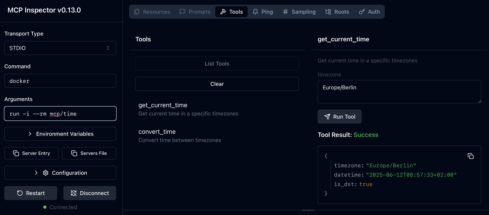 Der MCP Inspektor ist ein äußerst nützliches Werkzeug zum schnellen Testen von MCP Servern. Hier ein simples Beispiel für den mcp/time Server per Docker: